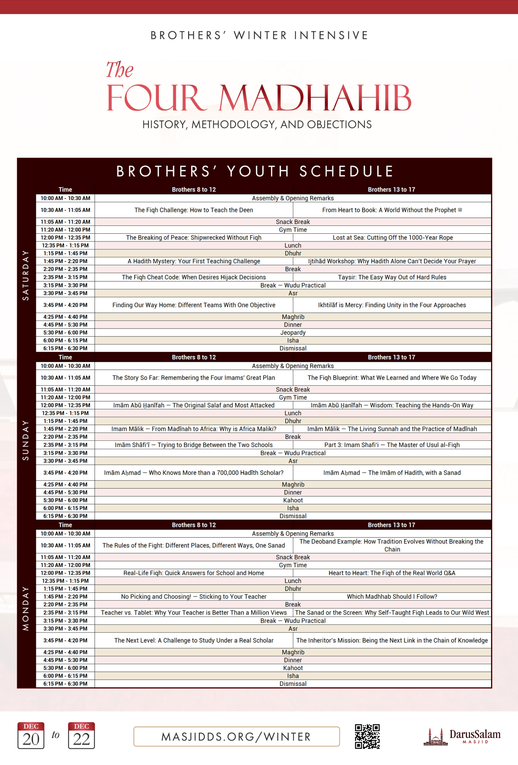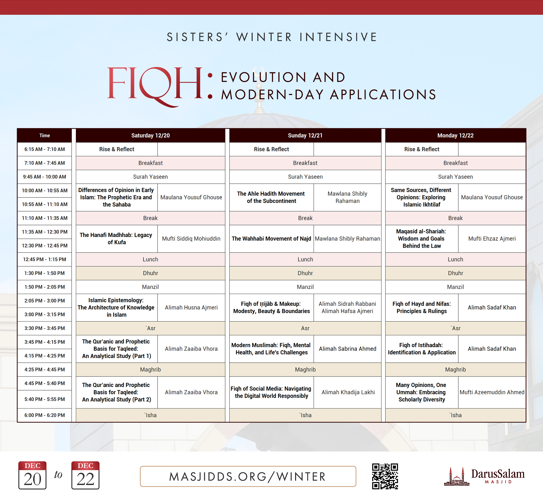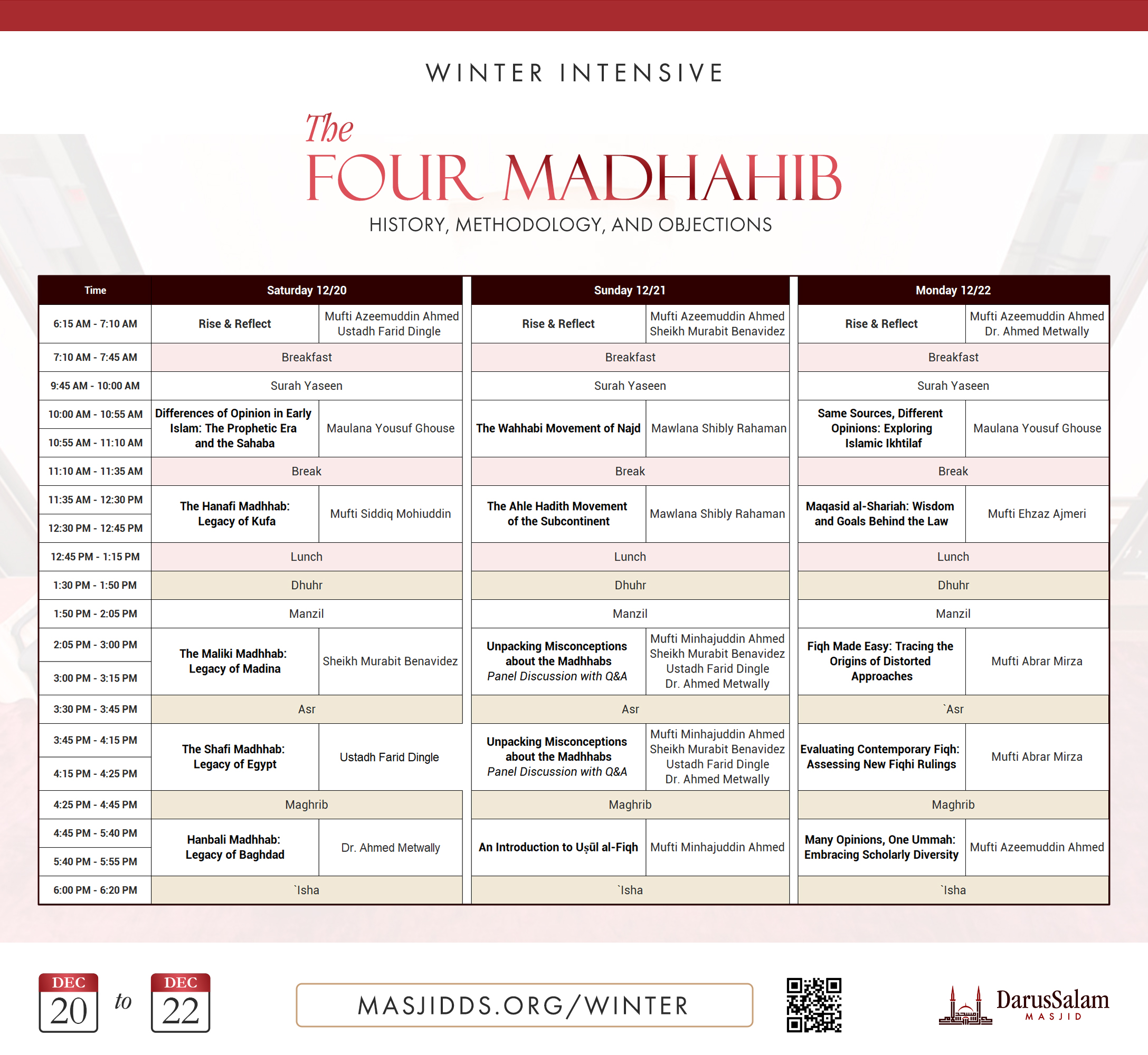 Alhamdulillah, this year we are blessed to have an amazing, diverse and highly qualified group of scholars for the Winter Intensive. Join us as these scholars provide an in-depth discussion on the four Madhahib, differences of opinions, development of fiqh, and more!